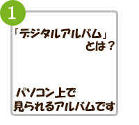 「デジタルアルバム」は、パソコン上でアルバムのように閲覧できるデータファイルです(パソコンで写真を編集してプリントアウトしたものをまとめたアルバム、という意味で使われている場合もありますが、こちらのページではパソコン上で使用できるデータファイルについて説明しています)。